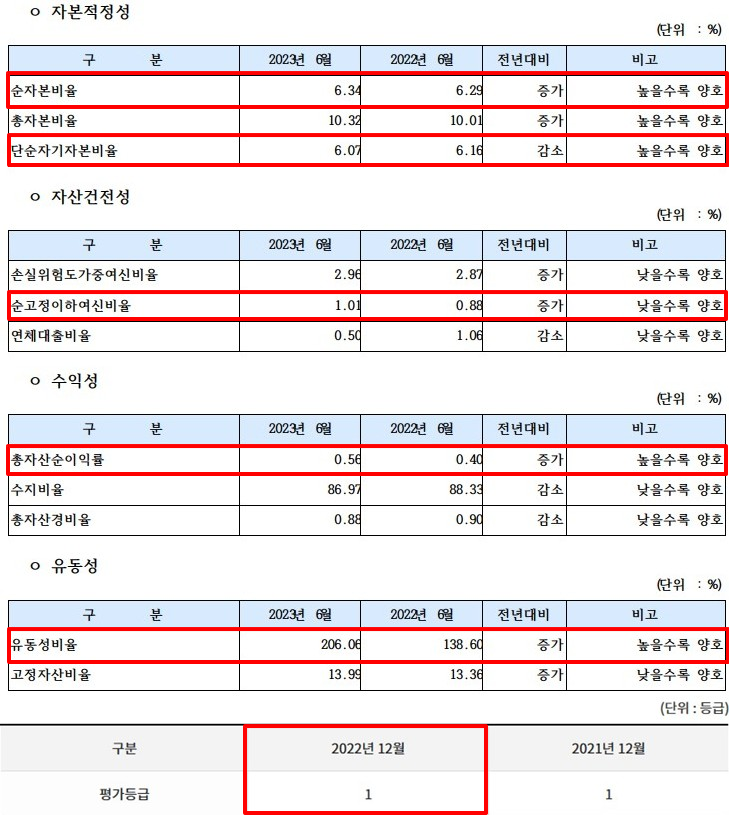 대방신협 본점 2023년 상반기 정기공시를 살펴보면 유동성비율 206.06%, 순자본비율 6.34%, 단순자기자본비율 6.07%, 순고정이하여신비율 1.01%, 총자산순이익률 0.56%, 평가등급 1등급입니다.
