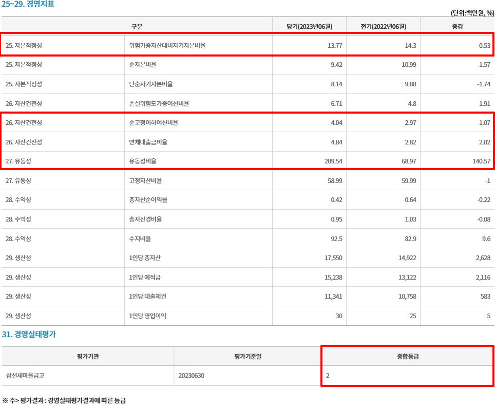 서울 삼선새마을금고의 2023년도 상반기 정기공시를 살펴보면 BIS자기자본비율 13.77%, 순고정이하여신비율 4.04%, 연체대출금비율 4.84%, 유동성비율 209.54%, 경영실태평가는 2등급입니다.