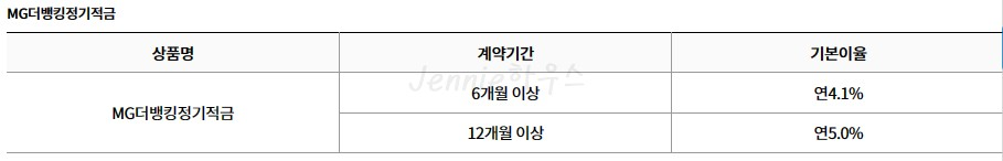 상품명은 MG더뱅킹정기적금이며 가입기간은 12개월 이상이고 가입금액은 월 1백만원 이내 입니다.