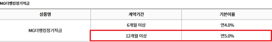 상품명은 MG더뱅킹정기적금이며 가입기간은 12개월 이상이고 가입금액은 월 1백만원 이내 입니다.