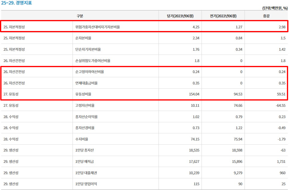 BIS자기자본비율 4.25%, 순고정이하여신비율 0.24%, 연체대출금비율 0.35%, 유동성비율 154.04%네요.